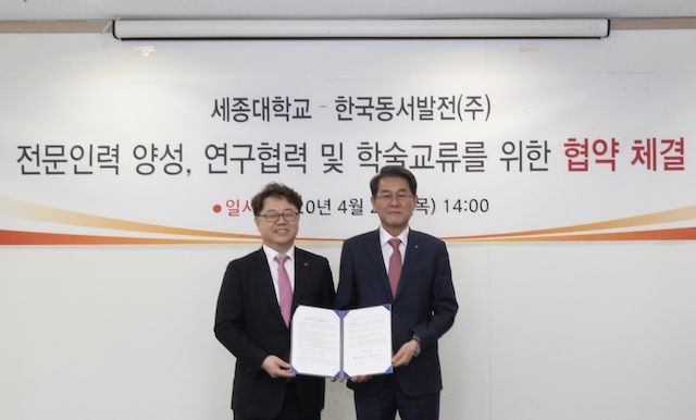 [환경미디어= 김명화 기자] 한국동서발전(사장 박일준)은 23일 세종대학교(총장 배덕효)와 '기후변화·에너지·환경분야 전문 인재 양성'을 위한 산학협력 협약을 체결했다고 밝혔다.